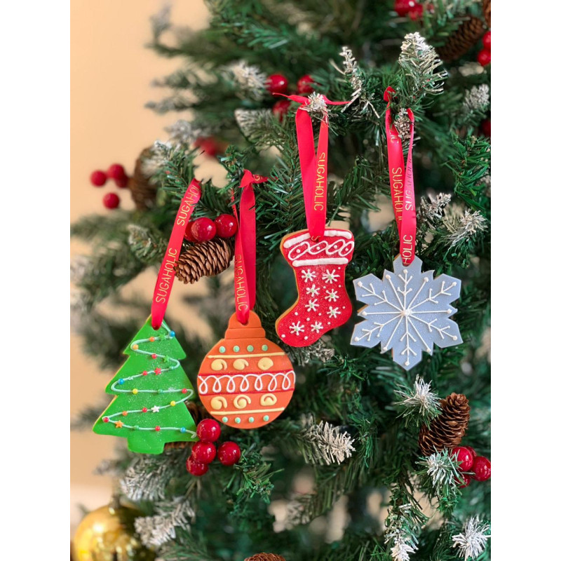 Each edible ornament is crafted from a buttery sugar cookie, decorated with vibrant holiday colors, and finished with fine detailing that resembles a real Christmas tree ornament.